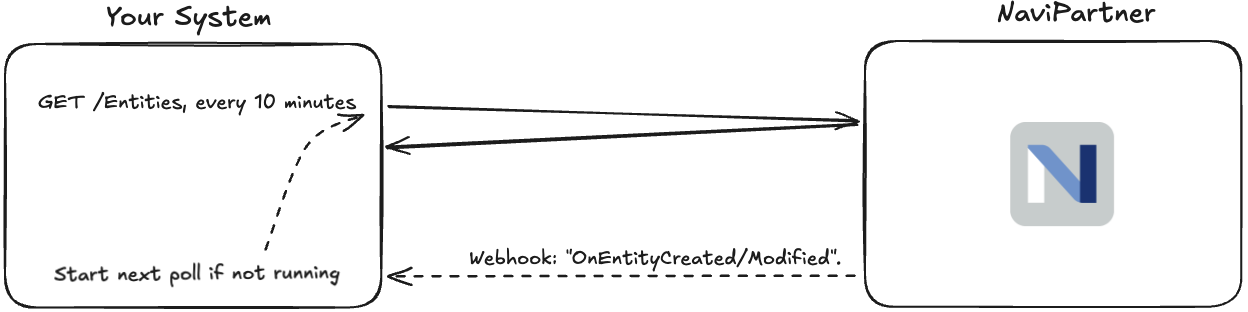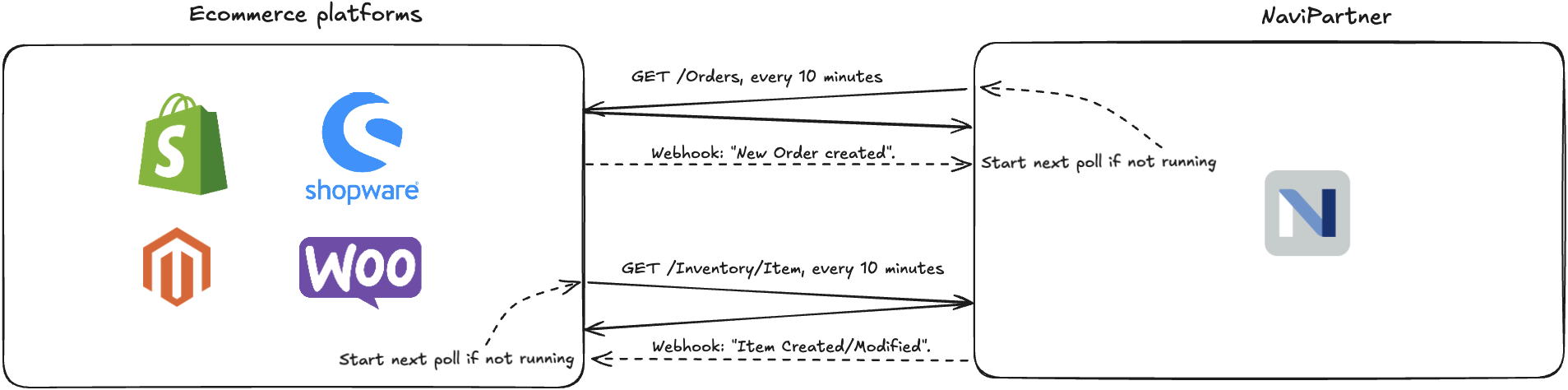 Remember that the poll+webhook best practices approach applies in both directions. Below, you see a simplified integration example between NaviPartner and an ecommerce platform. It is not always possible to follow the best practices due to platform limitations, but it is always worth knowing them.